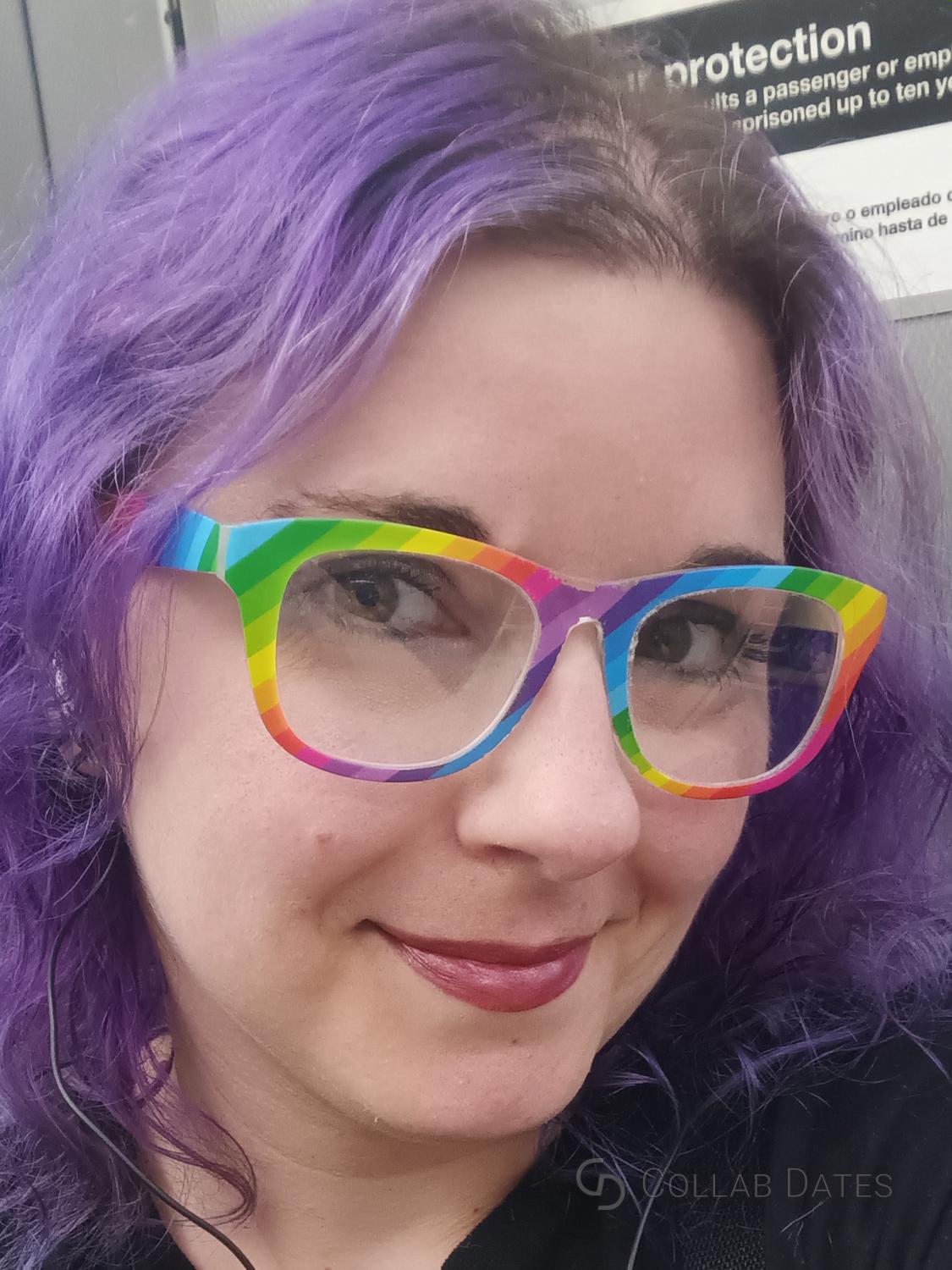 I'm a short, curvy, bisexual, pancraftual (knit, sew, cross stitch and weave) gal with purple hair, a huge back tattoo, pierced nipples and fun glasses (I own 21 pairs).